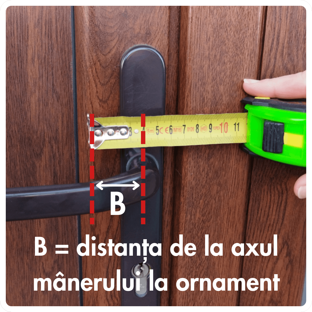 Masurati distanta, pe orizontala, de la axul manerului pana la muchia unde usa intalneste tocul. In imaginea de mai jos, aceasta este distanta A, intre cele doua linii punctate.