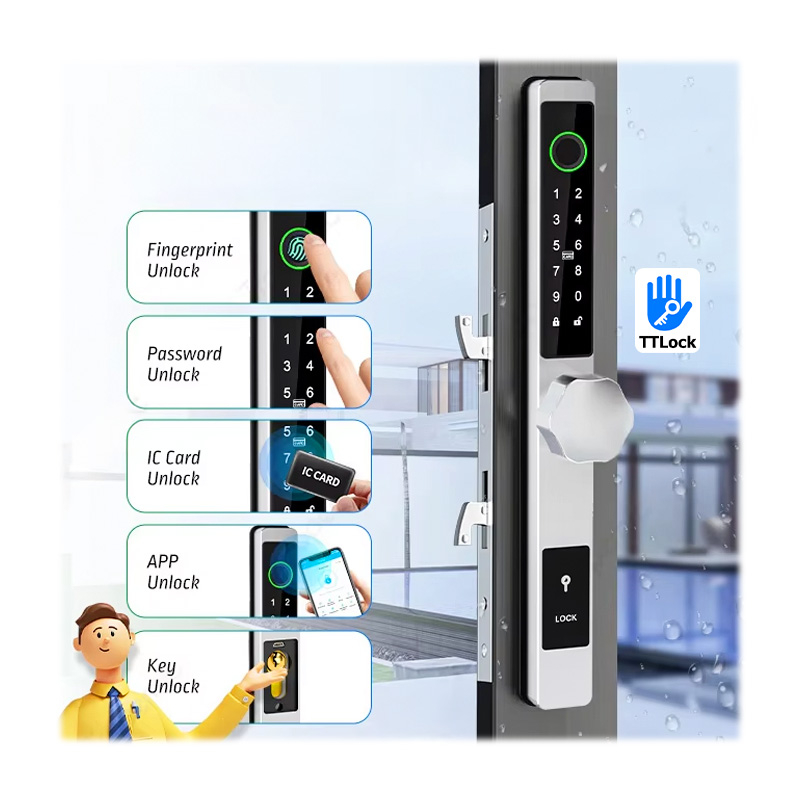 Deblocarea se realizeaza prin amprenta, cod numeric, card IC, aplicatia TTLock sau cheie mecanica. Sistemul permite pana la 100 de utilizatori per metoda de acces.
